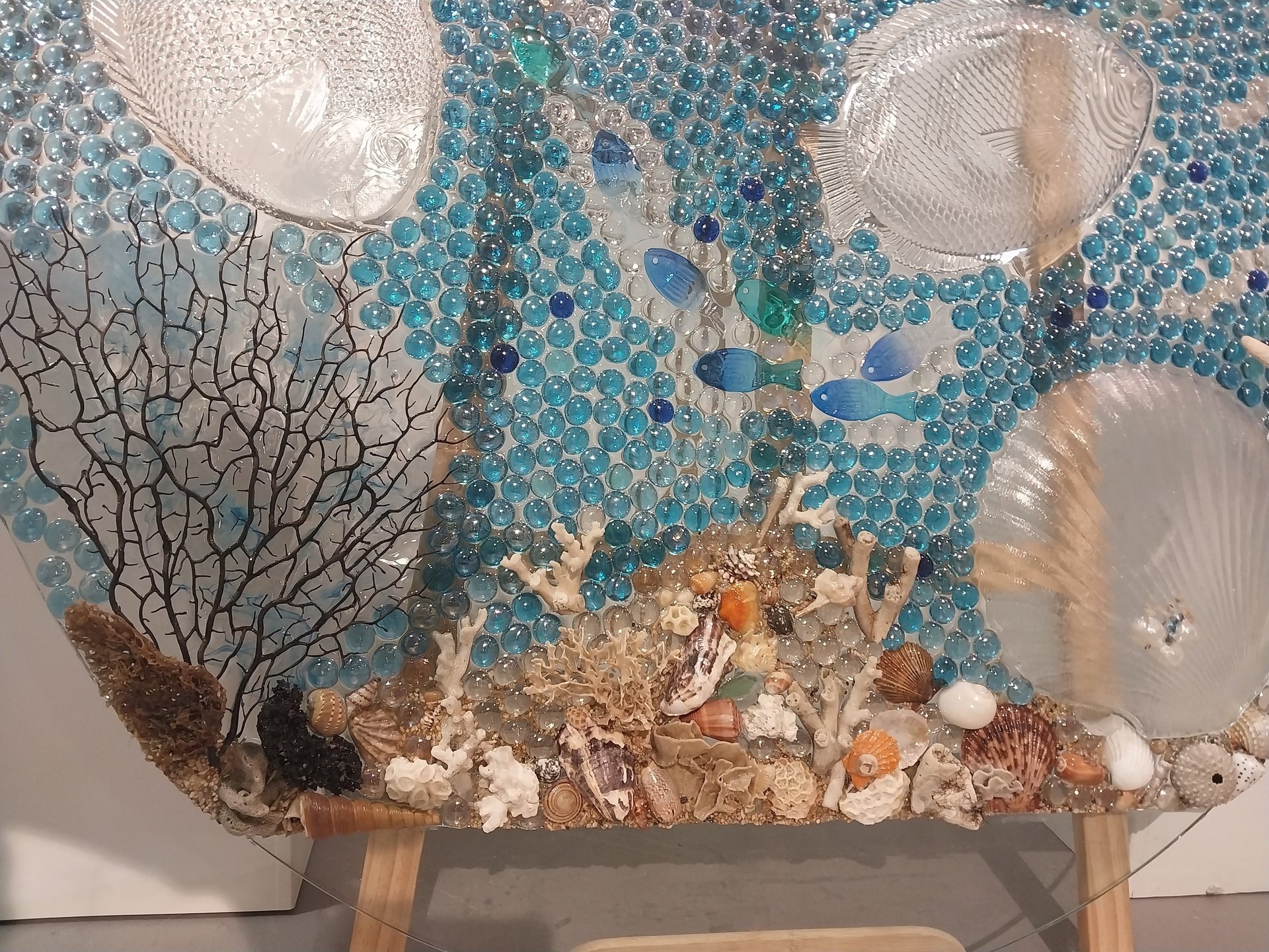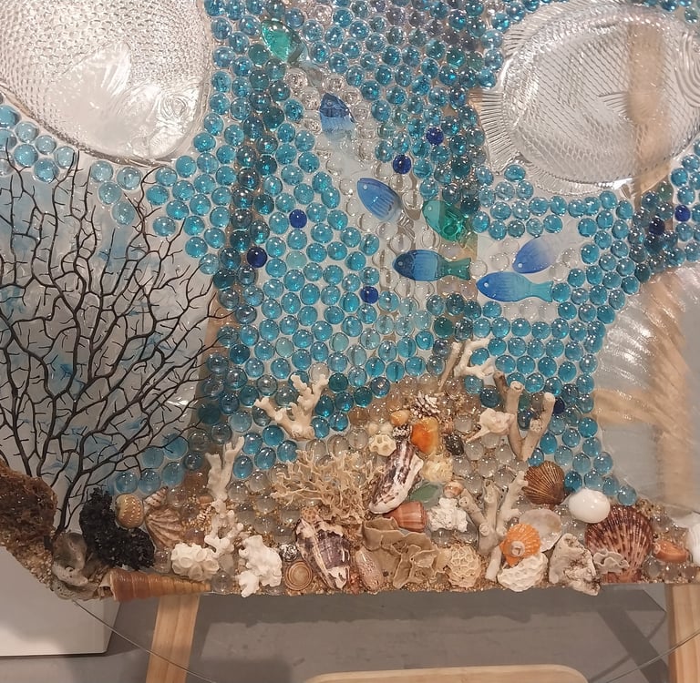 Glass, coral, and shell merge in this shimmering underwater world — a vibrant mosaic that speaks in the soft language of the reef.