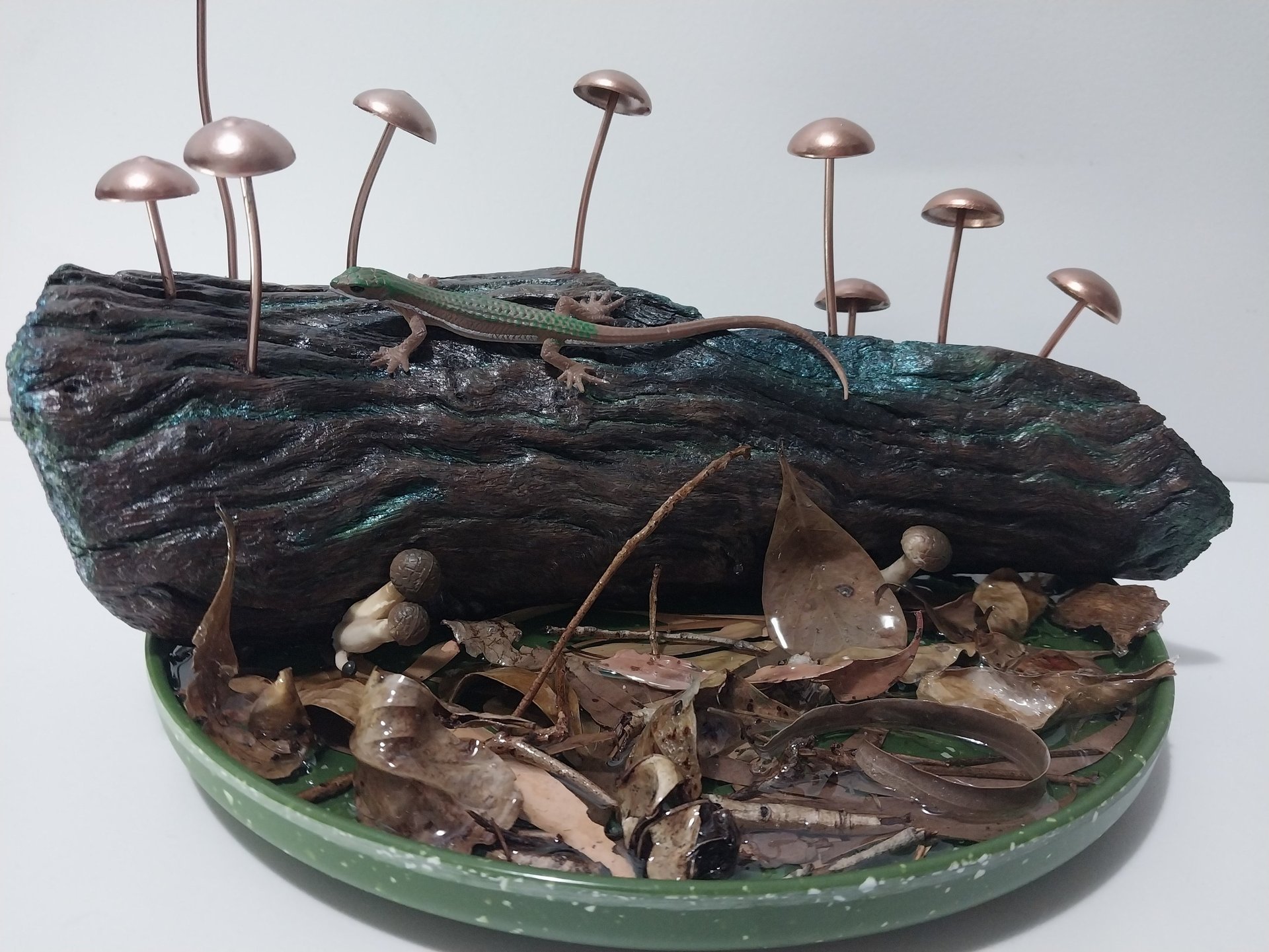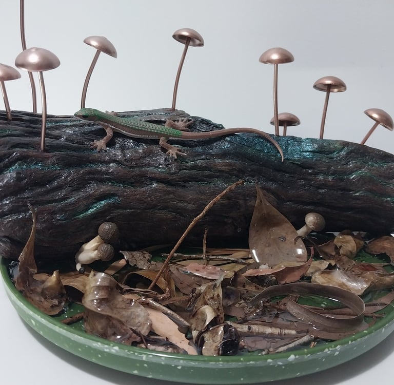A luminous reefscape unfolds in Reefsong, where glass stones swirl like currents and soft corals nestle between reclaimed ocean fragments. With vintage plates echoing ocean shimmer and fish forms suspended mid-drift, this circular piece honours the rhythm, memory, and quiet grace of the sea.