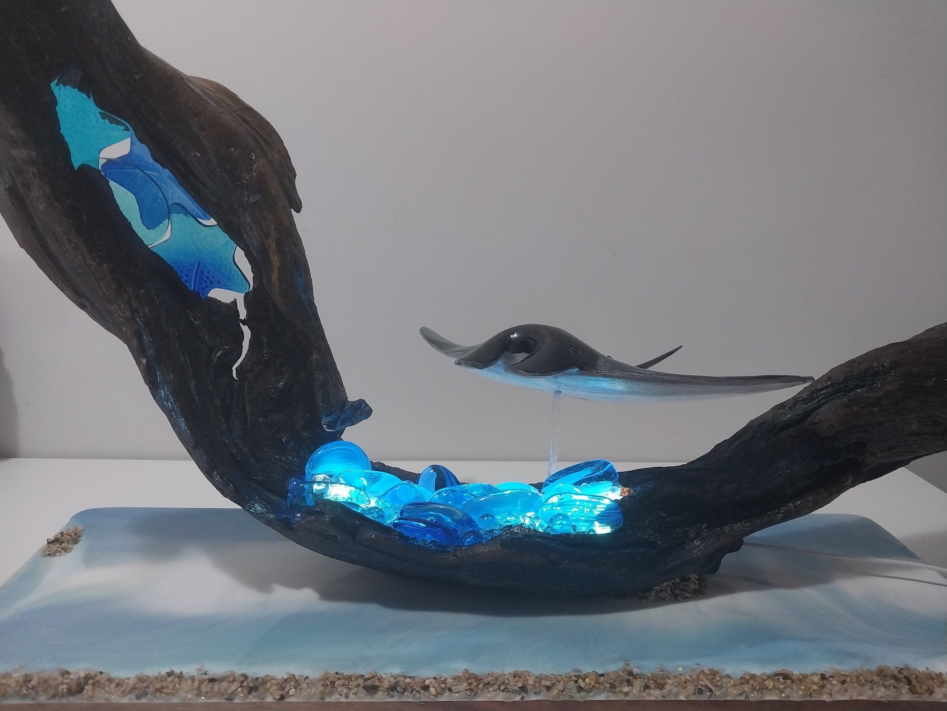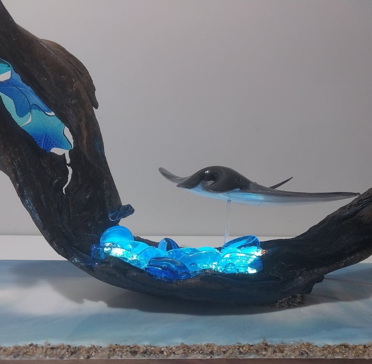 A lone ray glides through the curve of wave-washed driftwood, lit from beneath by glowing blue glass and resin. Ray of Light captures the quiet grace of ocean movement — where tide, creature, and sunlight meet in stillness