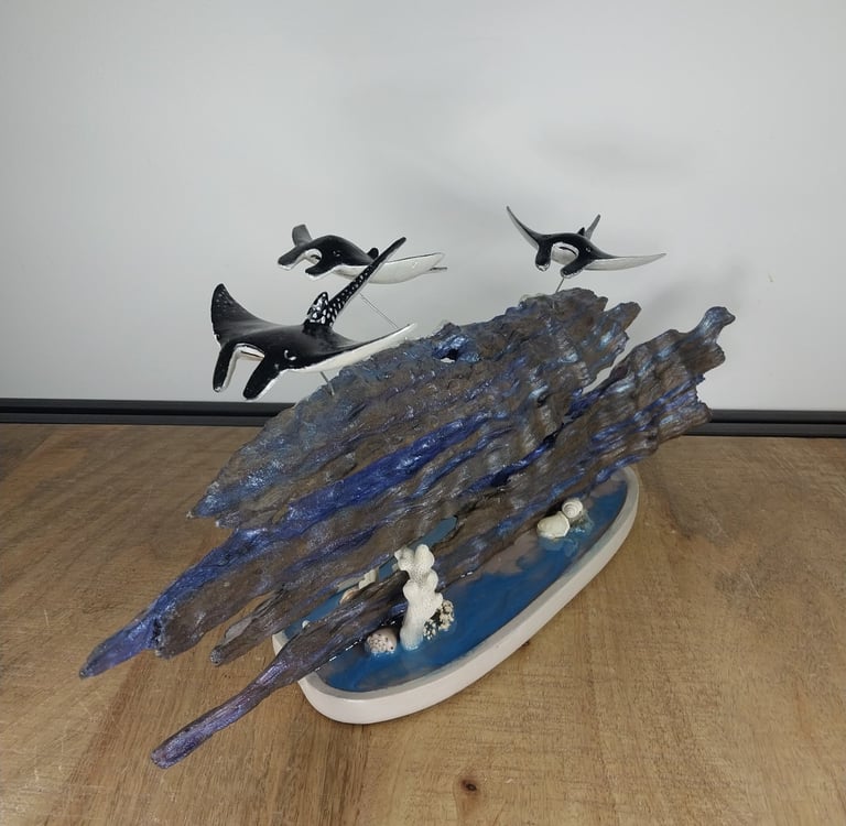 Eagle rays drift through painted timber and resin sea, their forms slicing the silence. A tribute to grace, space, and the stillness of deep movement.
