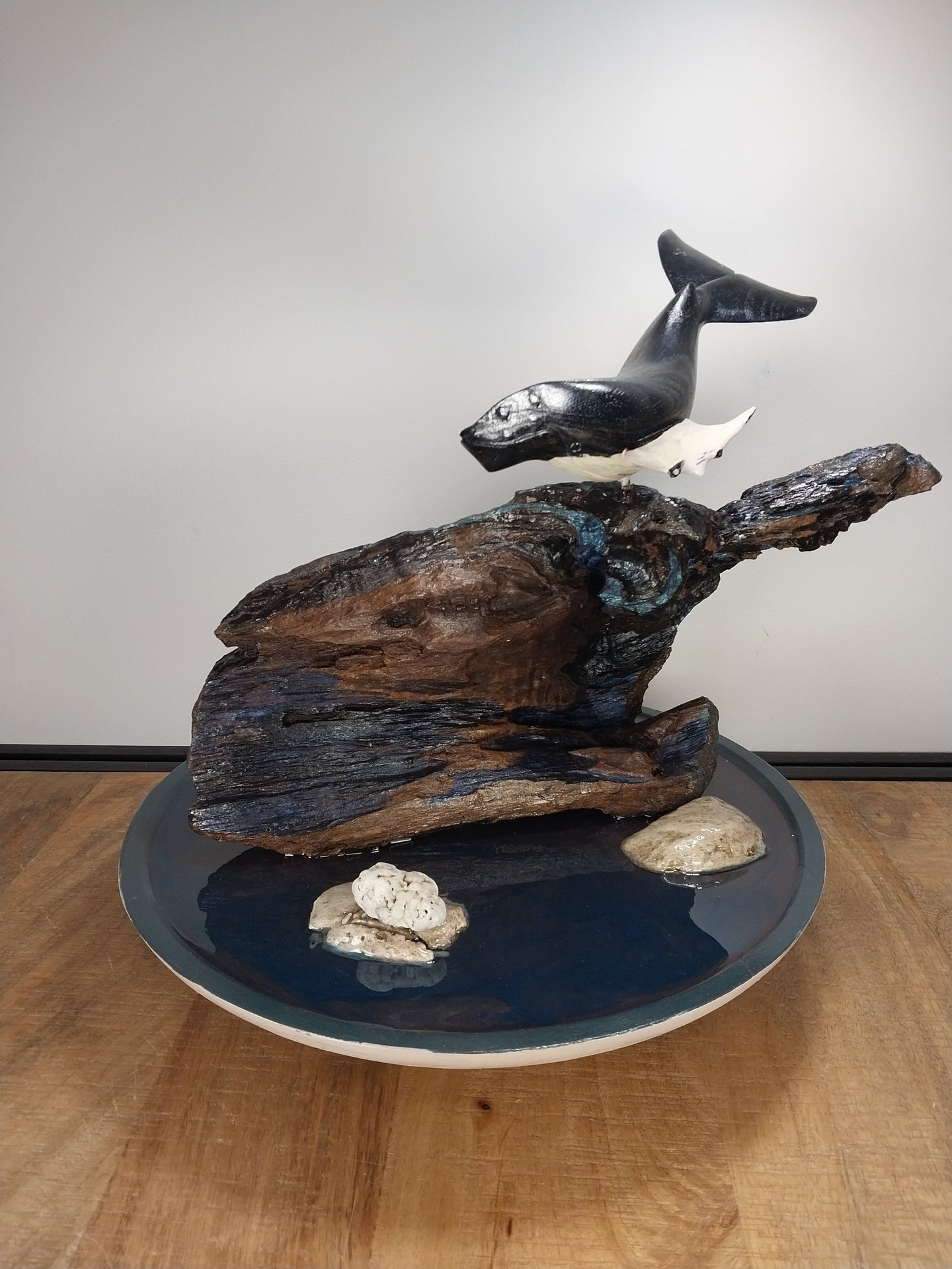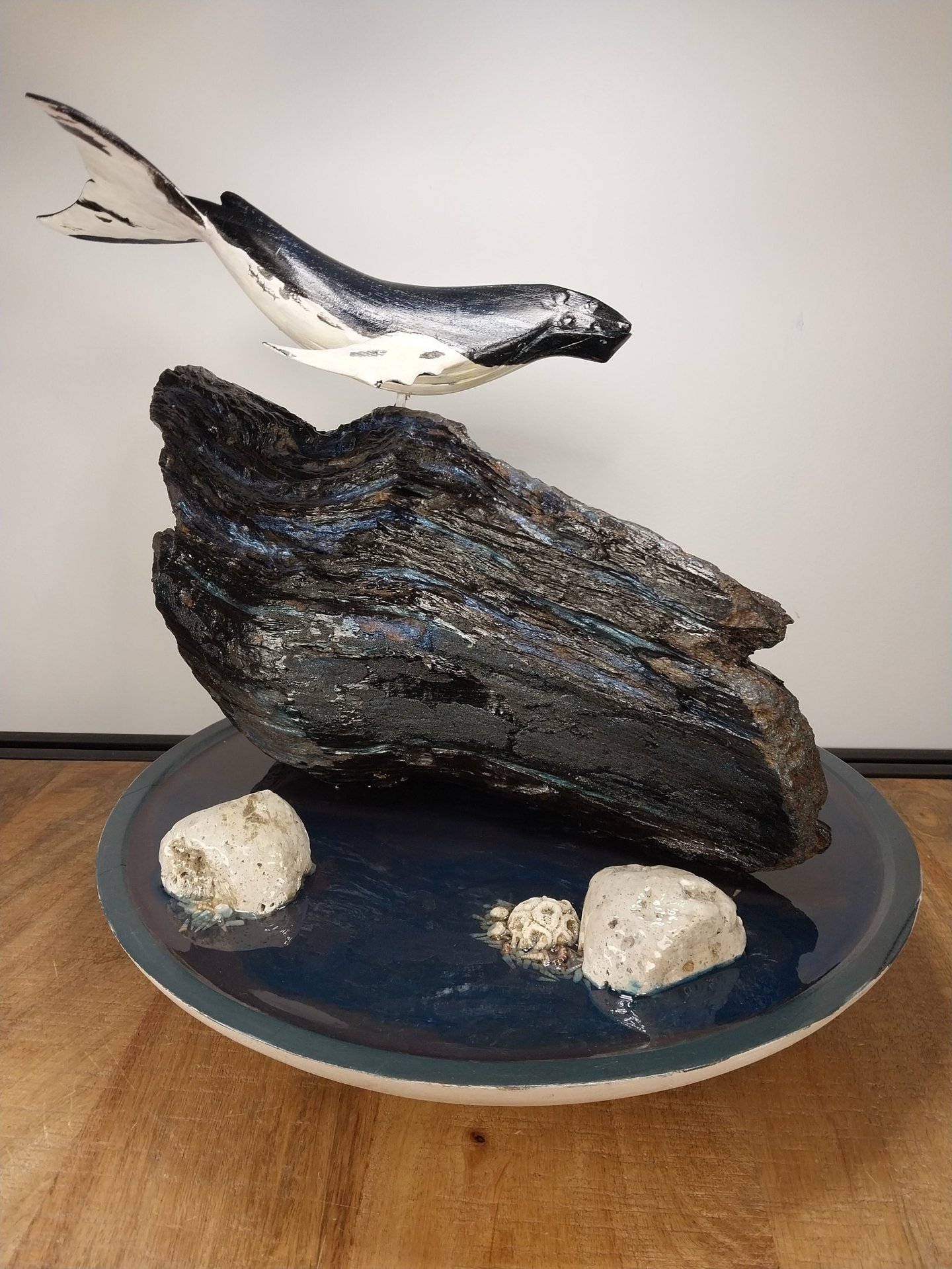 Materials: Reclaimed driftwood, hand-painted humpback whale, pumice stone, natural coral, hand-painted bas.