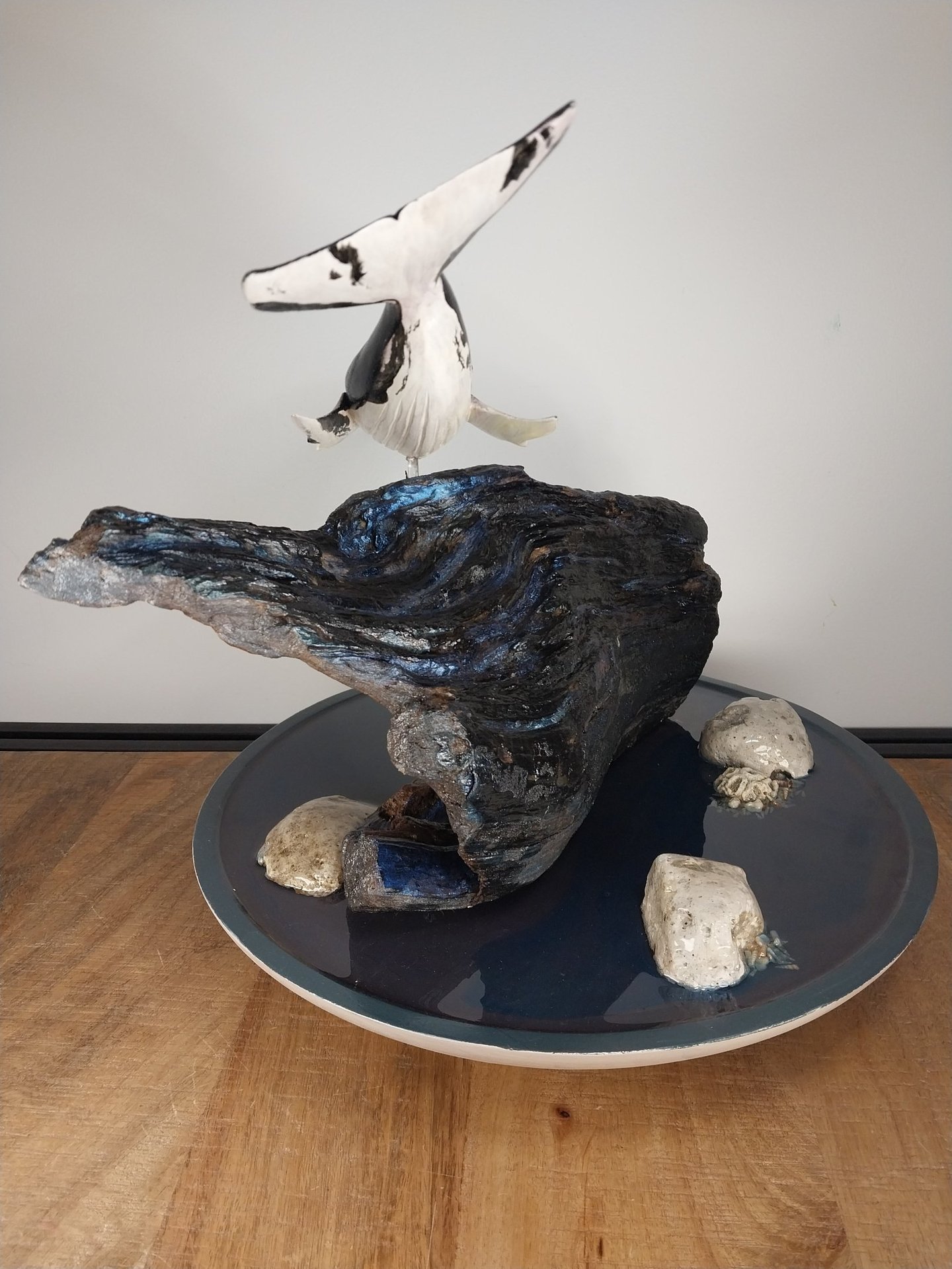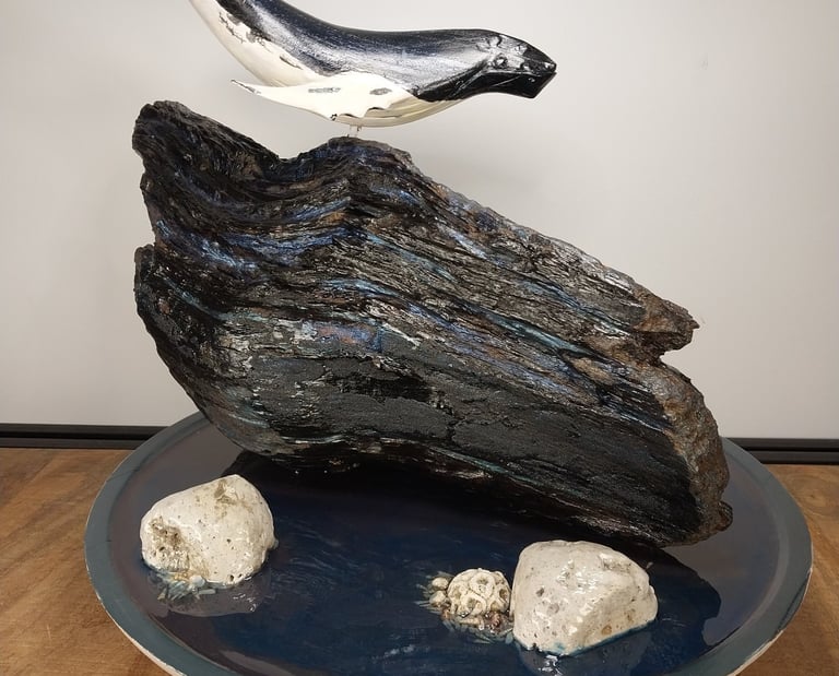 The hand-painted whale rises above a driftwood base deliberately chosen for its scale — a reminder that even these immense beings move within a sea far greater than themselves. That contrast, that dichotomy, holds meaning: vastness and vulnerability, strength and silence, the fragility of breath in a world that swells endlessly around it.