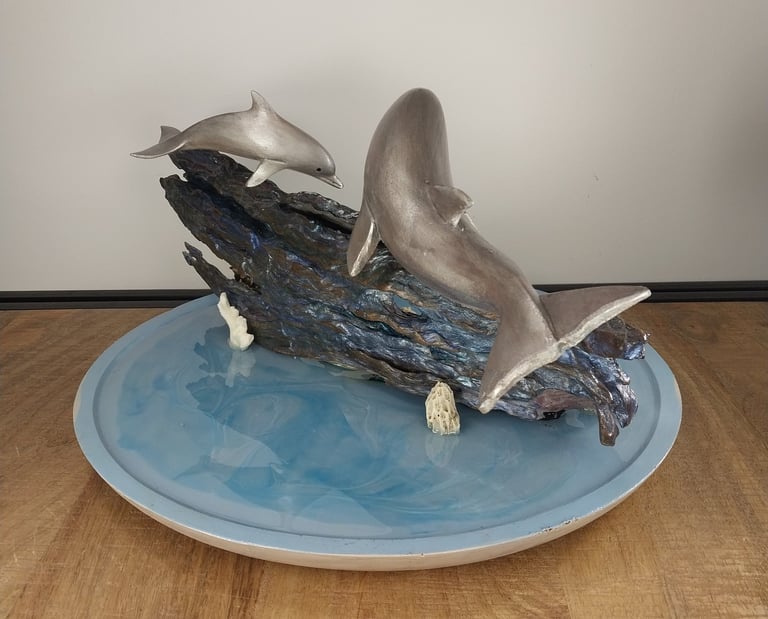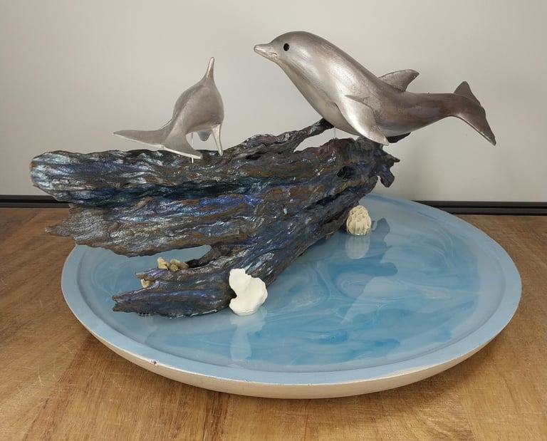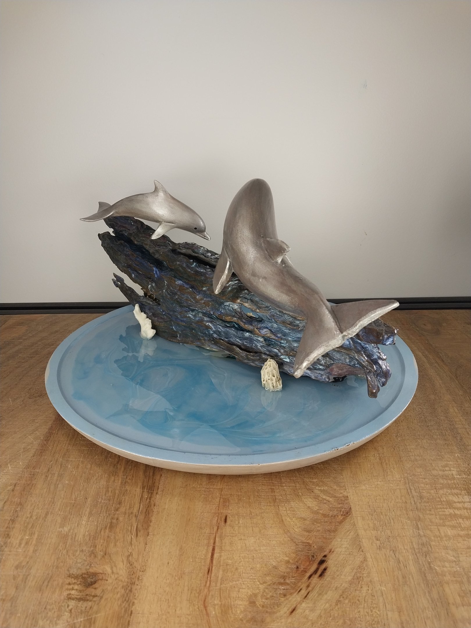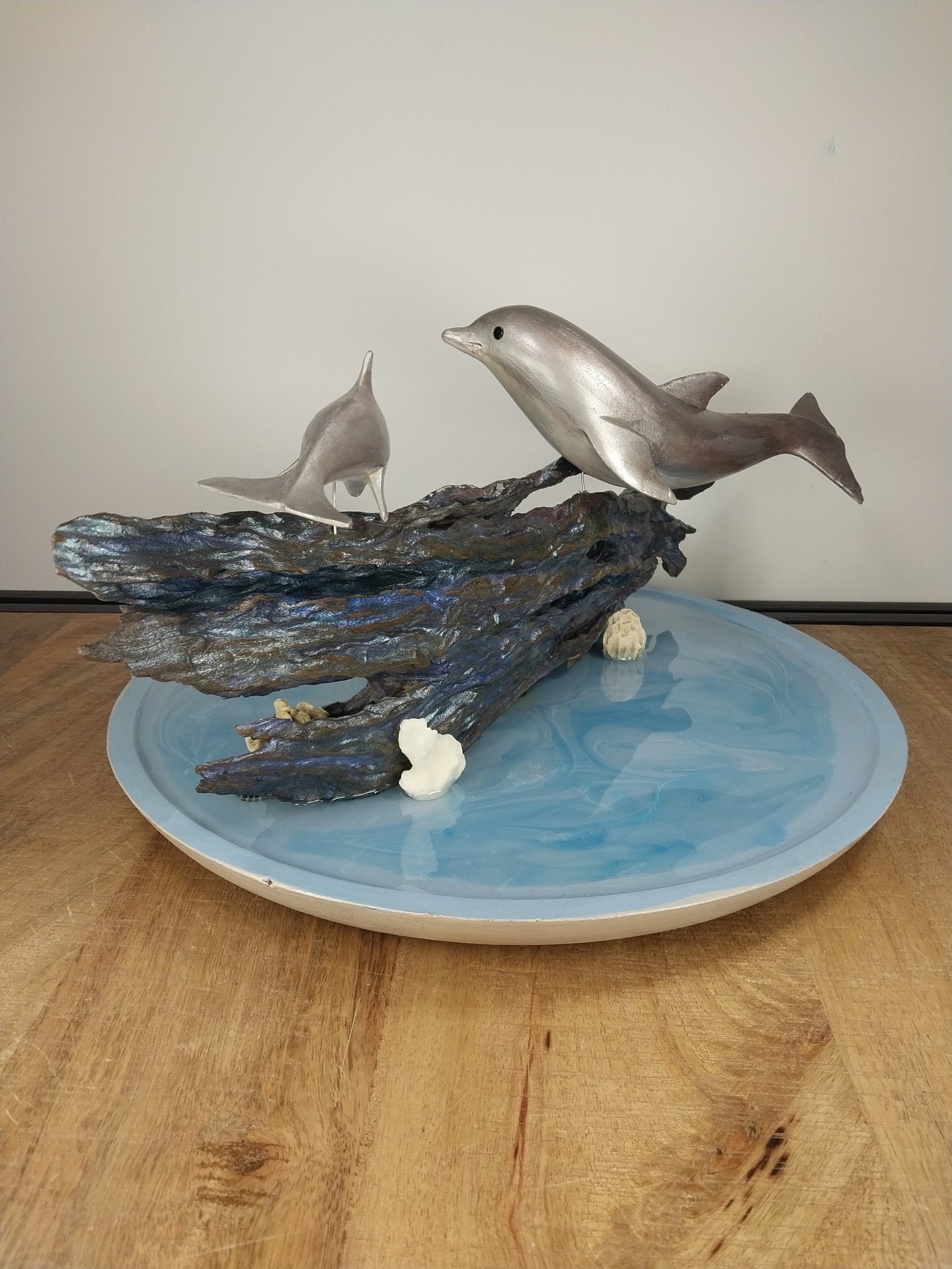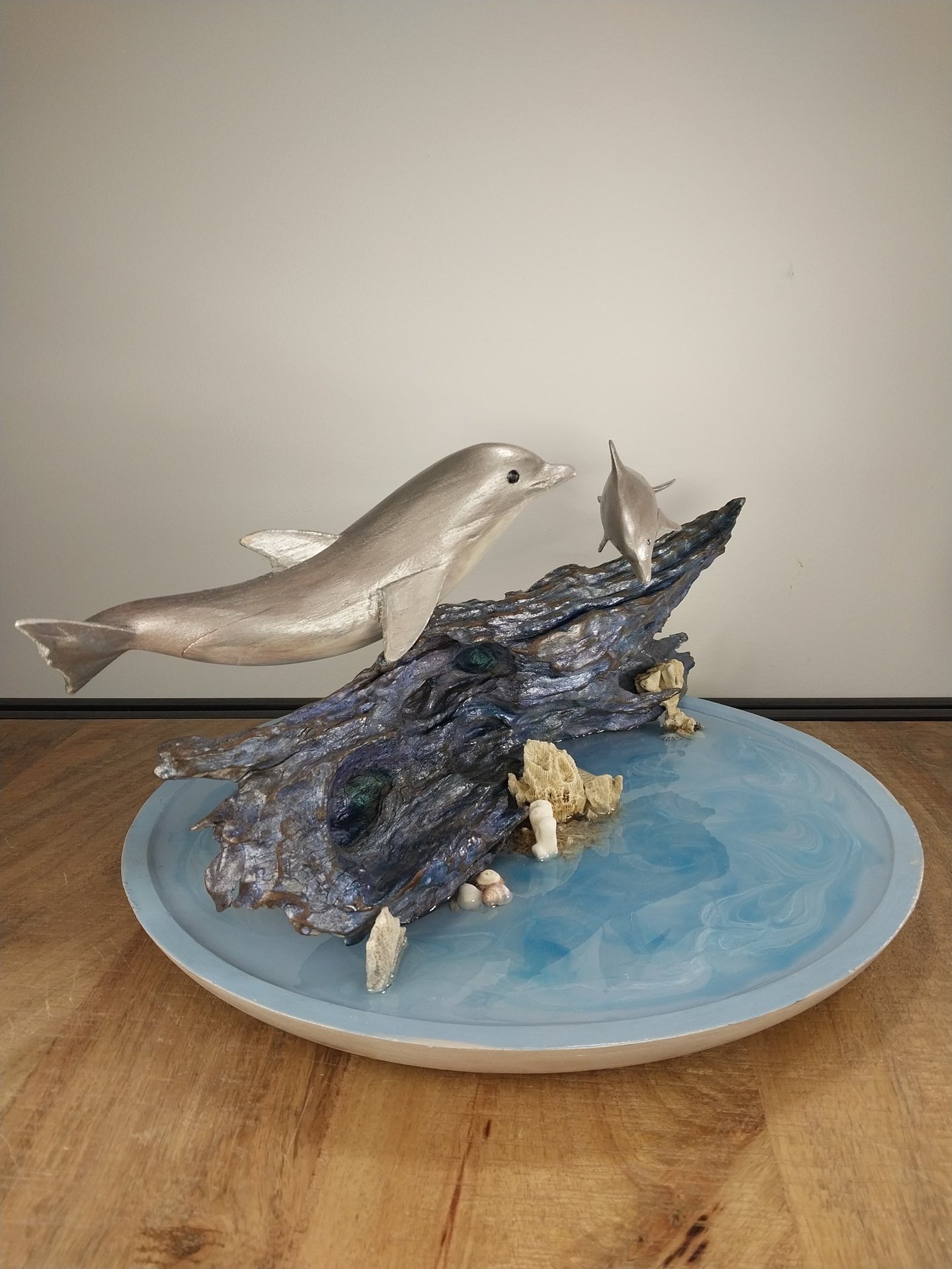 Materials: Driftwood, hand-painted dolphins, coral, shell, sand and resin