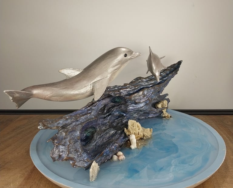 In this piece, Michelle brings that world to life with a curve of driftwood chosen for its flow — its movement echoing the very waters where these creatures were seen.